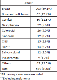 Conclusion: AYAs accounted for 14.1% of all new cancer cases. Breast cancer was the most common cancer among female AYAs, while bone and soft tissue cancers were the most common among males.