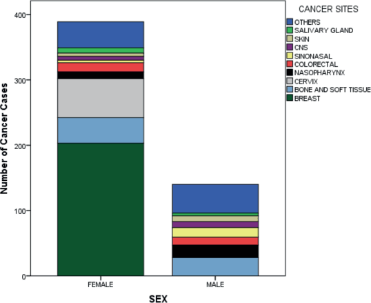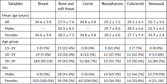 Results: There were 529 new cancer cases among AYAs, accounting for 14.1% of all cancer cases seen during the period. The male-to-female ratio was 1:3. The majority (72.8%) were in the 30–39 age range, with a mean age of 32.06 ± 6.18 years. Females had a higher mean age (33.01 ± 5.31 years) than males (29.43 ± 7.57 years) (p < 0.001). Breast (39.1%), bone and soft tissue (12.9%) and cervix (11.6%) were the most common sites of cancer in AYAs. Among the males, bone and soft tissue (20.0%), nasopharynx (13.6%) and sinonasal (10.7%) were the most common sites, while breast (52.2%), cervix (15.4%) and bone and soft tissue (10.0%) were the most common sites among females.