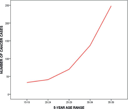 Cervical cancer was the third most common cancer among AYAs (11.6%) and the second most common malignancy among female AYAs (15.4%) and AYAs within 30–39 years (13.7%). AYA cervical cancer accounted for 6.7% of all new cases of cervical cancer. The mean age was 34.8 ± 3.8 years, the age range was between 23 and 39 years and the peak age was 39 years. The incidence steadily increased with an increasing 5-year age range till 30–34 years, after which a sharp increase occurred.