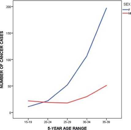 The incidence of AYA cancers increased with increasing age, with almost half (46.9%) occurring among those between 35 and 39 years (males: 36.4%, females: 50.6%). Miller et al [4] and Kakkar et al [9] also demonstrated similar findings in the USA and India. Compared to the females who had a sharp, steady increase in incidence with increasing age, there was an initial slight decline in the incidence among the males within age groups 20–24 and 25–29 years before a gradual increase.