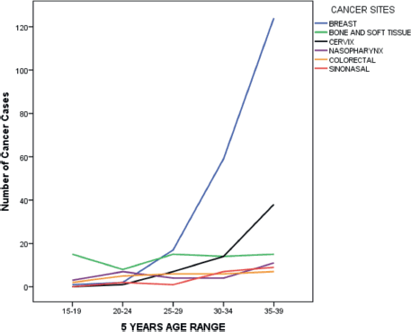 Breast accounted for almost two-fifths (39.1%) of AYAs' cancer sites, followed by bone and soft tissue (12.9%), cervix (11.6%), nasopharynx (5.6%) and colorectal (5.0%). (Table 2 and Figure 6) Among the male AYAs, bone and soft tissue accounted for a fifth (20.0%) of the cancer sites, followed by nasopharynx (13.6%), sinonasal (10.7%), colorectal (8.6%), central nervous system (CNS) (6.4%) and skin (6.4%). Among female AYAs, the breast was the most common site, accounting for 52.2% followed by cervix (15.4%), bone and soft tissue (10.0%), colorectal (3.6%) and nasopharynx (2.6%). (Table 3 and Figure 7) Among AYAs within 15–19 years, bone and soft tissue (46.9%), CNS (9.4%), nasopharynx (9.4%), colorectal (6.3%) and lip and oral cavity cancer (6.3%) were the most common cancer sites. Bone and soft tissue (21.5%), breast (17.8%), colorectal (10.3%), nasopharynx (10.3%) and cervix (7.5%) were the most common cancer sites among AYAs between 20 and 29 years, while breast (48.2%), cervix (13.7%), bone and soft tissue (7.6%), sinonasal (4.2%) and nasopharynx (3.9%) were the most common sites of cancers among AYAs between 30 and 39 years (Table 4 and Figure 8). The incidence of common cancers in AYAs increased with increasing age (Figure 9 and Table 5).