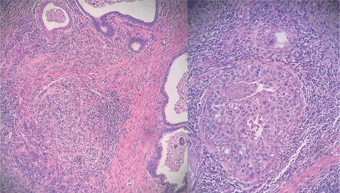 One month following the TURP, the patient developed symptoms of low-urinary tract obstruction again. Flexible cystoscopy was performed in the patient, showing synechiae in the surgical lodge. In June 2023, a new TURP was performed to resolve his urinary obstruction symptoms. The pathological findings were consistent with fibroglandular hyperplasia plus focal, isolated involvement of the intraprostatic canaliculus by high-grade urothelial carcinoma. Absence of infiltration of the prostatic stroma.