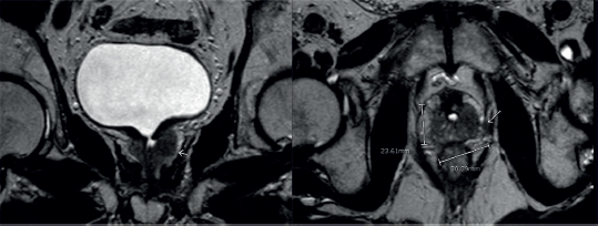 Figure 2. MRI shows an infiltrative tissue located in the left prostatic lobe. It is hypointense in the T2 sequence and enhances after endovenous contrast. It measures 30.3 × 23.6 mm.