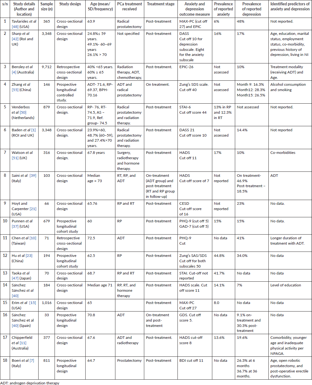 Notably, two treatment stages were identified in this review: the on-treatment stage and the post-treatment/ survival stage. Most of the studies (n= 15) assessed anxiety or depression or both in the post-treatment phase of PCa only, one assessed depression in the on-treatment phase only [55], while two assessed the same outcome in both the on-treatment and the post-treatment phase [39, 41] and one study assessed depression in the on-treatment stage alone [55]. Seven studies reported the prevalence rates of both anxiety and depression [11, 23, 37, 40, 42, 48, 51], eight reported rates of only depression [1, 4, 7, 10, 21, 39, 41, 55] and three reported rates of only anxiety [14, 47, 50]. Regarding the predictors of anxiety and depression, only nine studies reported them [4, 10, 11, 39, 40, 42, 48, 51, 55].