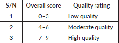 OEA and AO assessed the methodological quality of the included studies using the Joanna Briggs Institute (JBI) critical appraisal checklist [34] as summarised in Table 2. Also, a scoring system was used to rate the studies as having low, moderate or high quality based on the overall score. Similarly, where there were disagreements, they were resolved by discussing with another team member. The scoring and quality rating criteria are summarise in Supplementary Tables 1 and 2.