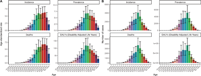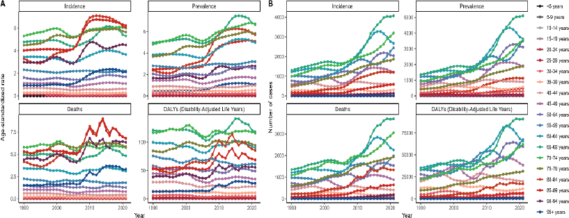 Figure 1. Visualises the trend of ASR and a number of cases for different age groups regarding incidence, prevalence, mortality and DALYs in China in 2021. (A) ASR of cases for different age groups regarding incidence, prevalence, mortality and DALYs. (B) A number of cases for different age groups regarding incidence, prevalence, mortality and DALYs.