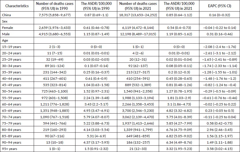 Table 3. The number of deaths cases and the ASDR attributable to A-LC in 1990 and 2021, and its trends from 1990 to 2021 in China.