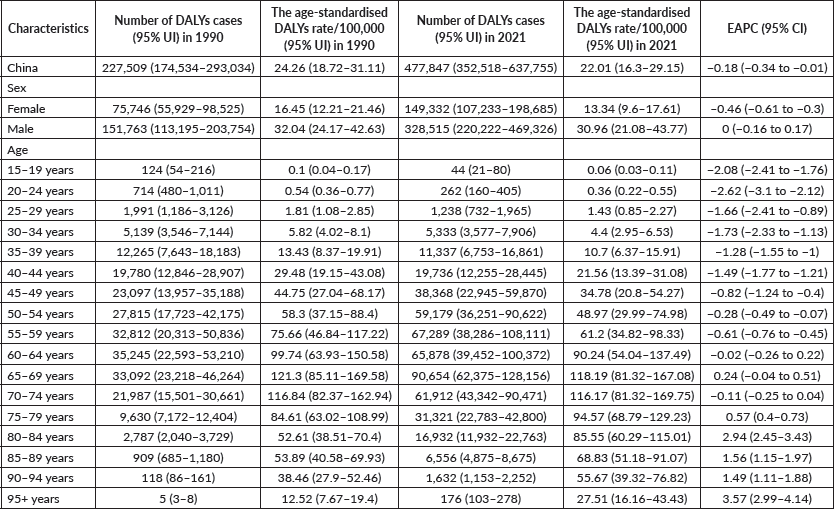 Table 4. The number of DALYs cases and the age-standardised DALYs rate attributable to A-LC in 1990 and 2021, and its trends from 1990 to 2021 in China.