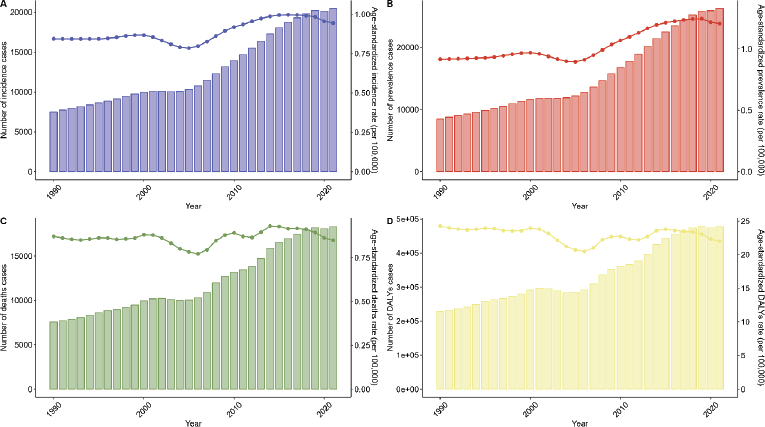 Figure 5. Shows the trends and numerical comparisons of the relevant age-standardised rates (per 100,000 population) and the respective corresponding number of cases for incidence, prevalence, death and DALYs of patients with alcohol-related liver cancer from 1990 to 2021.