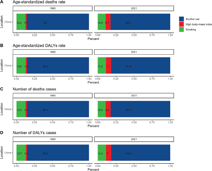 The proportion of patient deaths caused by obesity or alcohol abuse grew from 1.8% to 6.8% and 85.7% to 82.3%, respectively (Figure 6c). The percentage of DALYs for patients caused by obesity or alcohol abuse grew from 1.8% to 7% and decreased from 85.4% to 81.6%, respectively (Figure 6d).