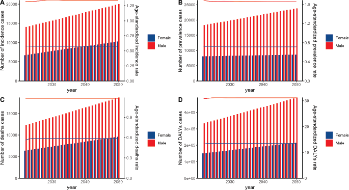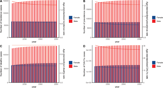 Figure 8. The predicted results in the A-LC-related numbers and age-standardised rates of ASIR, ASPR, ASDR and ASR of DALYs by sex in China from 2022 to 2050 of the ES model.