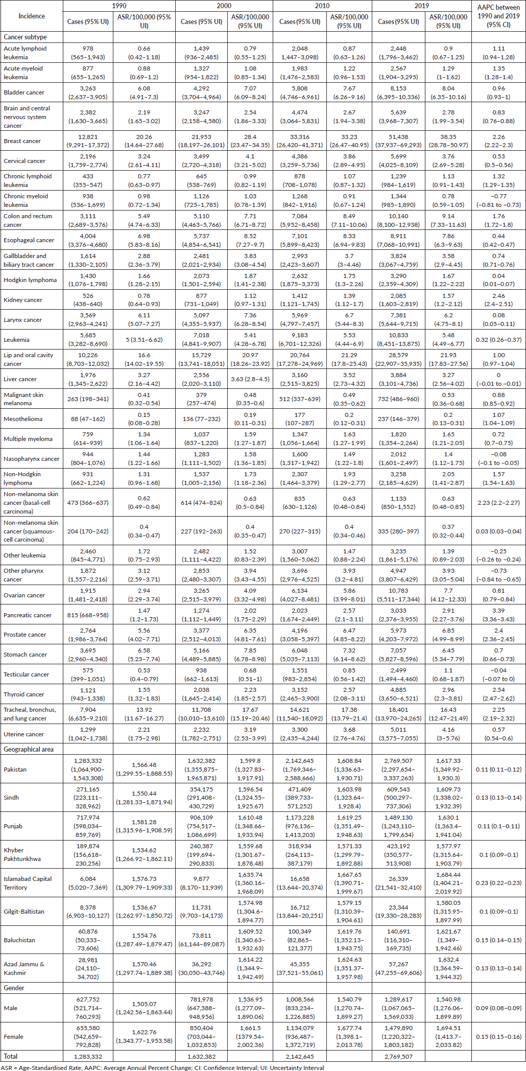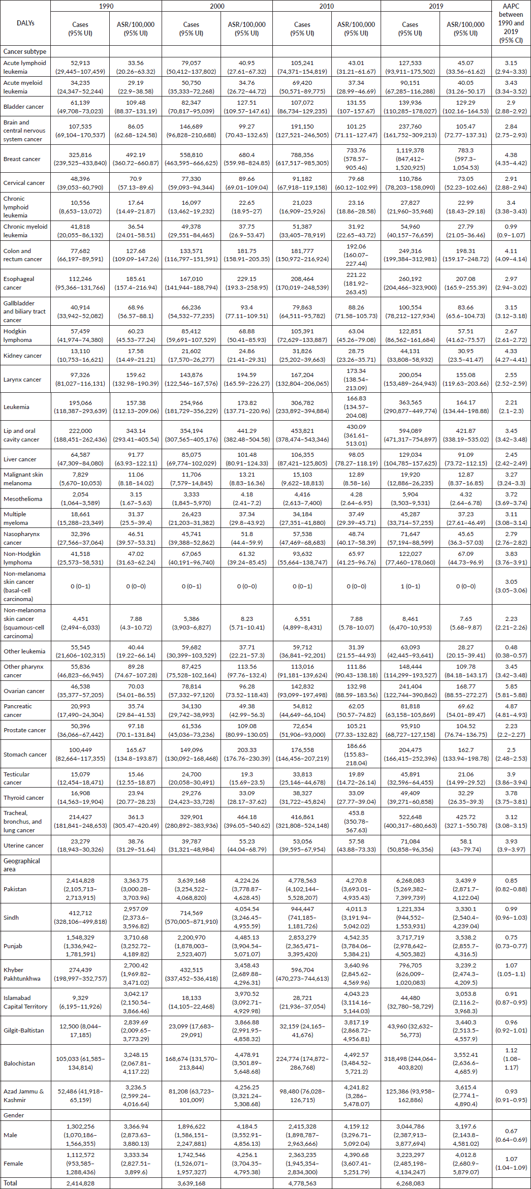 Methods: A population-based analysis was conducted using Global Burden of Disease (GBD) 2019 data. Cancer metrics, including incidence, mortality and disability-adjusted life years (DALYs), were extracted and stratified by age, gender, cancer type and geographic region. Annual average percent changes (AAPCs) were calculated to evaluate temporal trends. This study aimed to analyse trends in cancer incidence, mortality and DALYs in Pakistan from 1990 to 2019, using data from the GBD study.