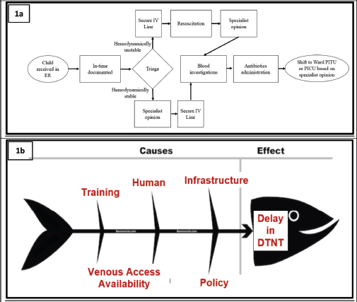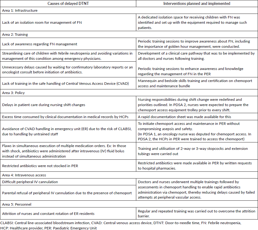 Methods: Baseline data of children less than 18 years of age on cancer chemotherapy presenting with neutropenic fever between January 2022 and June 2023 were collected ambispectively. A fishbone root cause analysis was performed. Interventions were planned and prioritised using a prioritisation matrix. QI measures were initiated subsequently in the form of the development and implementation of a validated clinical care pathway that described the triaging, clinical assessment, laboratory investigations, antibiotic dosing and patient disposition. Additionally, mannequin-assisted, followed by bedside training on chemoport handling, was performed. Post-intervention data, including the 6-months sustenance phase, were collected, and outcomes were analysed.