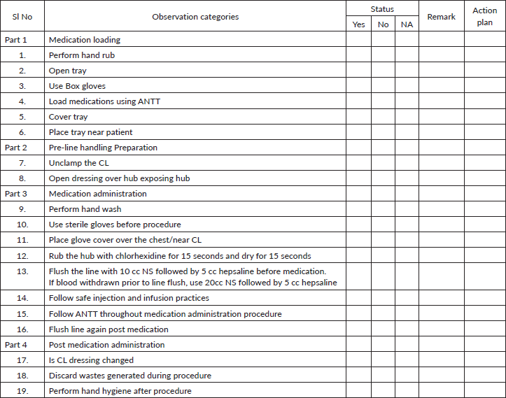 Dependence on an oncology nurse for chemoport needle insertion was seen as a barrier to optimal execution of the CCP. Hence, doctors and nurses in the PER underwent periodic simulation-based training on chemoport needle insertion. During this period, they were posted for 1 hour daily, on rotation, in the oncology day-care ward to obtain bedside training in chemoport access. This was achieved in three phases – observation of chemoport access, access chemoport with assistance and access chemoport independently but under the supervision of an oncology day-care nurse. This was documented by the HCPs in their academic logbook (Annexure 5). HCPs were considered competent and allowed to access chemoports in PER if they completed two observations, two insertions with assistance and two insertions independently with >80% adherence to the checklist.