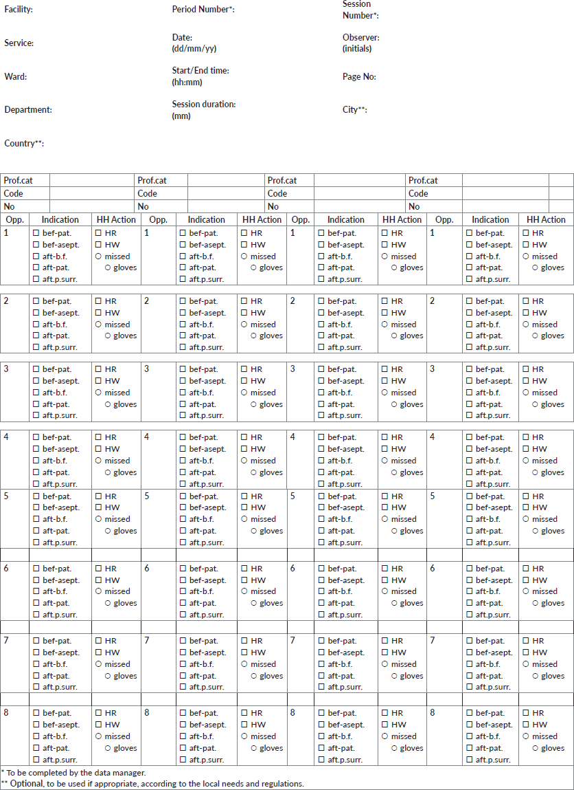 Each column of the grid to record hand hygiene practices is intended to be dedicated to a specific professional category. Therefore numerous health-care workers may be sequentially included during one session in the column dedicated to their category. Alternatively each column may be dedicated to a single health-care worker only of whom the professional category should be indicated.