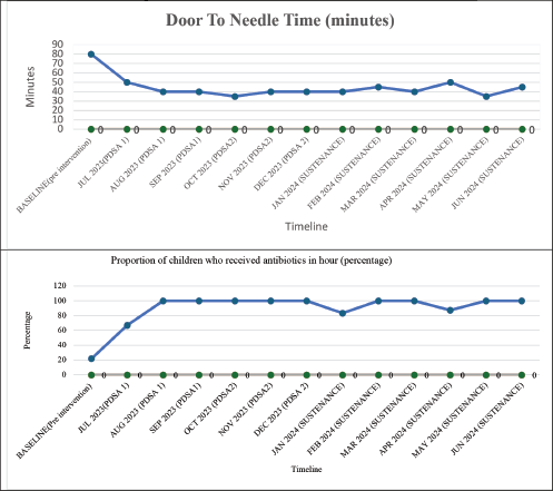 PICU admissions in our cohort dropped to zero in the post-intervention and sustenance period. Increasing awareness among HCPs, effective implementation of the CCP and accessing the chemo port to administer antibiotics were probably the measures undertaken that effectively reduced the requirement for ICU. Salstrom et al [8] studied the impact of QI interventions on TTA and clinical outcomes. They observed that the need for ICU reduced by 20% (p = 0.003) when a TTA of less than 60 minutes was achieved. A retrospective cohort analysis found that 60-minute TTA intervals were associated with composite adverse events outcomes that included PICU admission, fluid resuscitation and mortality [7].