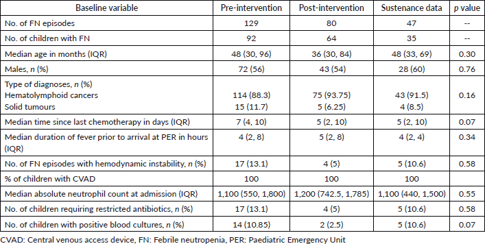 Results: In the baseline, intervention and sustenance periods, 129, 80 and 47 episodes of FN, respectively, were documented. Median DTNT reduced by 50% from a baseline of 80 minutes interquartile range (IQR 65–105) to 40 minutes (IQR 30–40) post-intervention (p < 0.001). The proportion of children with optimal DTNT increased from 22% to 92.5% (p < 0.001). DTNT > 60 minutes was significantly associated with intensive care admissions. Root-Cause-Analysis revealed difficult peripheral venous access, lack of awareness and implementation challenges as the most important causes for delays in antibiotic administration.