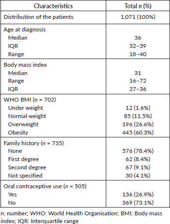 Between 2008 and 2017, a total of seven thousand, one hundred and eighty BC patients were registered in the two centers. Out of these, 17% (n = 1227) were aged ≤40 (BCY). Among the BCY, one hundred patients were either duplicated or only registered but never treated in either of the two hospitals, hence were excluded. In the remaining 1,127 patients, 56 patients presented with de novo stage IV and were further excluded. We focused our analysis on the BCY patients with stages I–III disease (n = 1071) as illustrated in Figure 1. In the included patients, around 9% of the patients had some missing documentation data, varied from one variable to another, so these were excluded from the statistical analysis of each variable and the total number of included patients in each variable is mentioned in our data tables (Tables 1–3). In addition, a total of 12% of the patients were lost to follow-up at some point from 2008 to 2017.