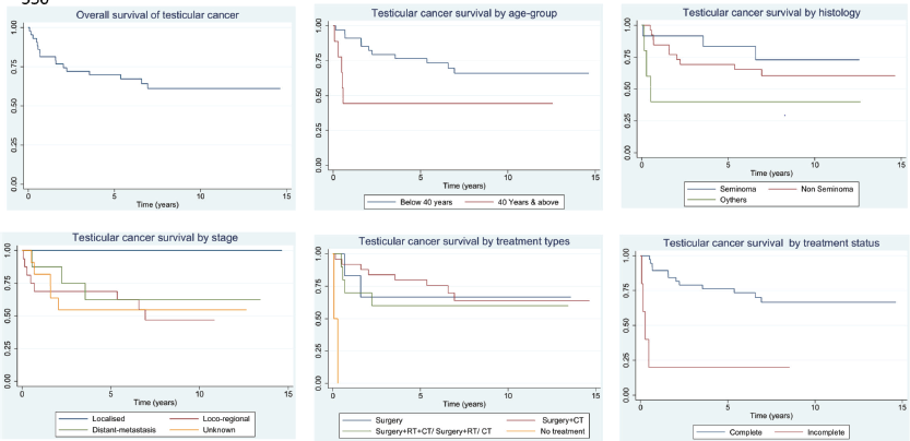 Figure 2. Overall survival, survival by age group, histology, treatment types and treatment status of testicular cancer patients in Ratnagiri district (2009–2018).