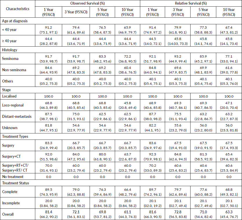 Table 3: Results of the observed and relative survival of testicular cancer patients by selected background characteristics