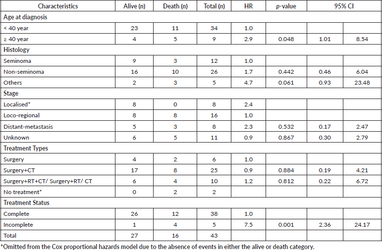 The results of the Cox proportional hazard model of testicular cancer patients by selected background characteristics show that the survival outcomes varied between histology, stage at diagnosis and treatment types, but the results were not statistically significant. However, for the age at diagnosis, the survival of testicular cancer was lower among patients with age more than 40 in contrast to those less than the age 40 at the time of diagnosis, and the results were statistically significant (Hazard ratio (HR: 2.9) 95% CI: 1.01–8.54). Similarly, results were statistically significant for treatment status, where those with incomplete treatment had poor survival outcomes (HR: 7.5, 95% 2.36–24.17] than their respective counterpart. Details are presented in Table 4.