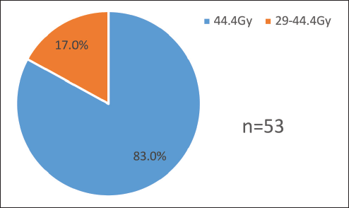 For each patient, a QS regimen was administered. Forty-four (83.02%) of the 53 patients received the whole dosage of 44.4 Gy without interruption. The remaining nine (16.9%) patients passed the study's inclusion criteria even though they interrupted treatment after obtaining two-thirds of the recommended dosage because of machine failure, and they received a radiation dose above or equal to 29.4 to 40.4 Gy. The study removed seven individuals who took fewer than two-thirds of the recommended dosages (Figure 1).