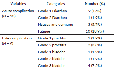 Based on CTCAE, acute complications were detected in 23 (43.4%) of the study participants. The most common acute complication was fatigue, which was seen in 10 (18.9%) patients, followed by Grade 1 diarrhea seen in 9 (17%) patients, and nausea and vomiting seen in 3 (5.7%) patients. After the first cycle and within 6 weeks of RT, 9 (17%) of the individuals had subacute complications. Four patients (7.5%) had Grade 3 bladder problems, which were the most prevalent, followed by two patients (3.8%) who had Grade 2 proctitis. RTOG standards for late radiation morbidity were used to classify subacute toxicity for the bladder, colon and pelvic subcutaneous tissue (Table 3). Table 3 shows treatment-related adverse events seen in cervical cancer patients treated with QS regimen.
