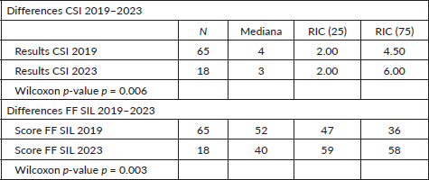 FF with FF-SIL in 2019 presented a median of 51.10 (48.83,53.37) versus the FF-SIL test of 2023, which had a median of 44.72 (39.19,50.25); the difference between medians was 5.7 p = 0.003 (Table 2).