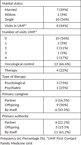 The results of those who were monitored by the Family Medicine Unit found that 56% were not monitored, 44% went for a medical consultation; of this percentage, 50% went for 4 annual consultations. 78% did not have any type of psychological follow-up, 22% went for a mental health check-up; of this group, 75% had psychological therapy and 25% psychiatric therapy (Table 5).