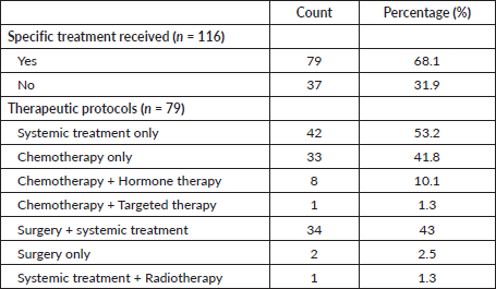 A total of 77 patients received systemic treatment, always including chemotherapy as a first-line therapy. The anthracycline-based protocol was the most frequently prescribed. 44.1% of patients received 2 treatment lines, and aromatase inhibitors dominated hormone therapy prescriptions (53.8%; n = 07). Only two patients received targeted therapy (Trastuzumab). More than half of the patients in our study (67.6%) were adherent to the prescribed systemic treatments.