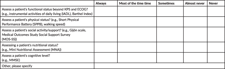 • Knowledge of the ASCO geriatric oncology guidelines (yes/no).