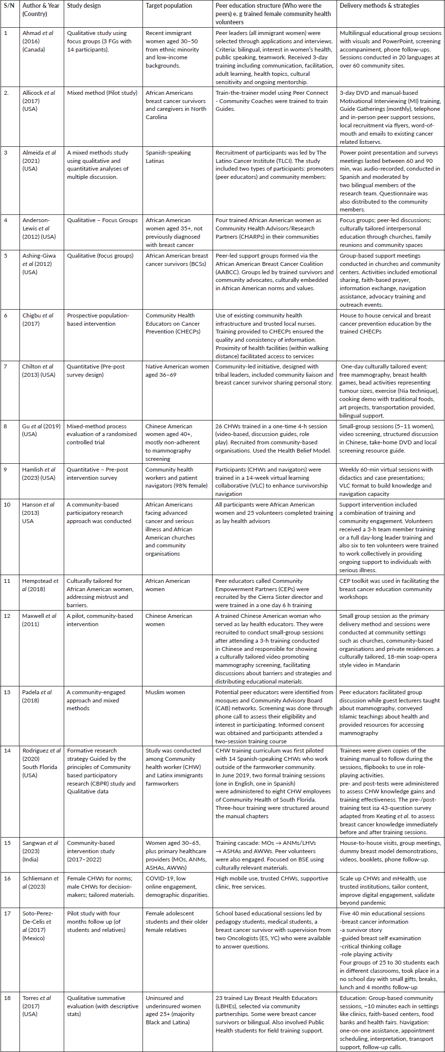 Result: Out of 818 studies initially retrieved, only 18 met the eligibility criteria and were reviewed, covering diverse locations and participant groups, mostly from high-income countries. The studies showed that peer education delivered through various methods and tailored to cultural contexts significantly improved breast cancer awareness, screening behaviours and community engagement, though challenges like role confusion, cultural barriers and logistical issues were also reported.