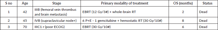 Three patients received treatment with palliative intent. One patient with Stage IIIB disease presented with femoral vein thrombosis and brain metastases. Another patient had Stage IVB disease with fine needle aspiration cytology-confirmed supraclavicular lymph node involvement. The third patient had Stage IIIC1r disease with poor performance status (Eastern Cooperative Oncology Group (ECOG)) and was given palliative RT for local symptom control. Treatment details are mentioned in Table 6.