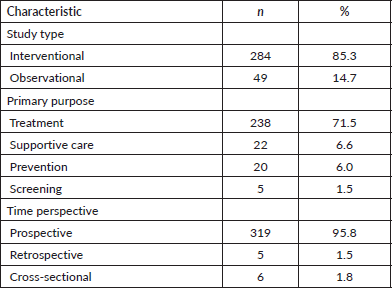Most trials were interventional (85.3%), with observational studies accounting for 14.7% (Table 3). Treatment was the primary objective in 71.5% of trials, followed by supportive care (6.6%), prevention (6.0%) and screening (1.5%). The majority employed a prospective design (95.8%), with retrospective (1.5%) and cross-sectional (1.8%) designs less common. Among observational studies, cohort designs (44%) were the most common, followed by case-control (13.6%) and other models (Table 4).