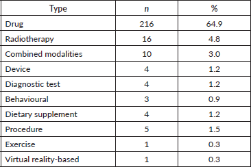 Drug-based interventions predominated, accounting for 64.9% of trials. Other interventions included radiotherapy (4.8%), combined treatment modalities (3.0%), procedures, diagnostic tests, behavioural interventions and devices (Table 5).