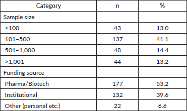 Funding was primarily provided by pharmaceutical or biotechnology companies (53.2%), followed by academic or institutional (university-based) sources (39.6%) (Table 6). Other funding sources accounted for 6.6%.