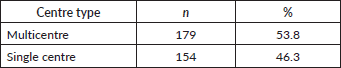Table 7. Centre type. Distribution of included trials by centre type, comparing single-centre and multicentre studies.
