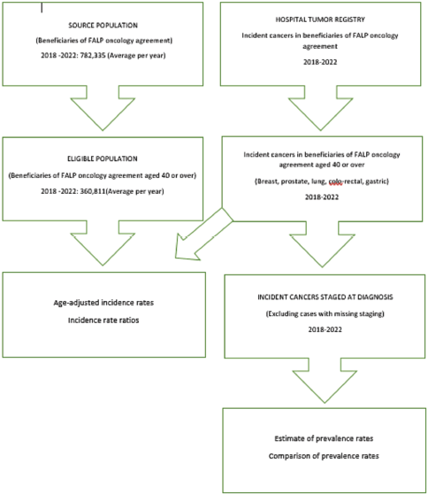 This cross-sectional study focused on all health insurance beneficiaries aged 40 years or older enrolled in the ‘Oncology Agreement’ of the Oncology Foundation Institute (FALP) as of December 31 between 2018 and 2022. Using the FALP Tumour Registry, we identified all new cases of breast, prostate, lung, colorectal and gastric cancers diagnosed in individuals aged 40 years or older during this period by activating cancer insurance. The type of malignancy, age, sex and clinical stage at diagnosis and date of diagnosis were recorded.