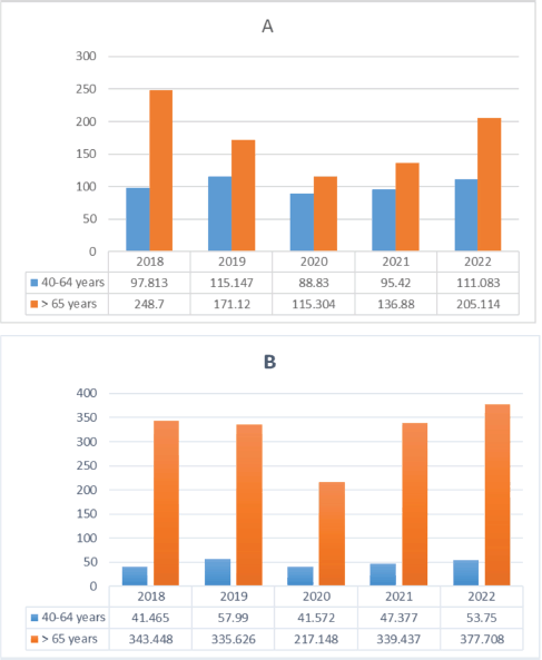 Figure 2. Age-adjusted incidence of breast cancer (a) in older women and in the rest of the female cohort over 40 years of age in the FALP oncological agreement between 2018 and 2022. Age-adjusted incidence of prostate cancer (b) in older men and in the rest of the male cohort over 40 years of age with FALP Oncology Agreement between 2018 and 2022 (cases per 100,000).