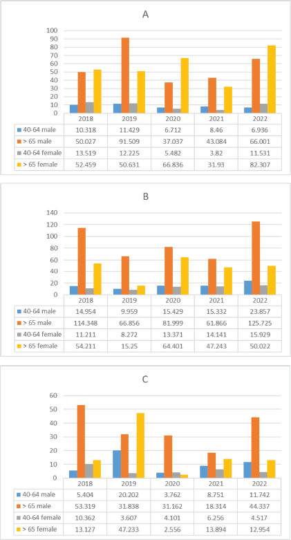 Figure 3. Age-adjusted incidence of lung (a), colorectal (b) and gastric (c) cancer in older adults and in the rest of the population over 18 years of age with FALP Oncological Agreement, by sex, between 2018 and 2022 (cases per 100,000).