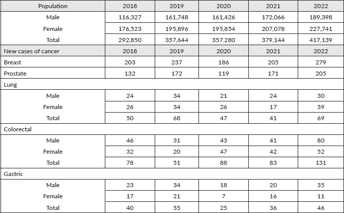 Table 1. Population over 40 years of age in the FALP Oncological Agreement and new cases of breast, prostate, lung, colorectal and gastric carcinomas during the years 2018, 2019, 2020, 2021 and 2022, according to sex when applicable.