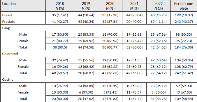 Table 2. Proportion of new cases of breast, prostate, lung, colorectal and gastric carcinomas in clinical stage III–IV at the time of diagnosis, in the years 2018, 2019, 2020, 2021 and 2022, according to sex when applicable.