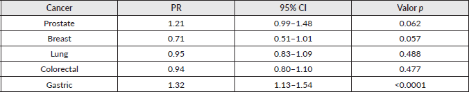 Table 3 presents the PR of advanced clinical stages (III and IV) for older adults compared to younger individuals for prostate, breast, lung, colorectal and gastric cancers. The PR was significantly higher for gastric, with a trend toward lower risk for breast cancer, though this was not statistically significant.
