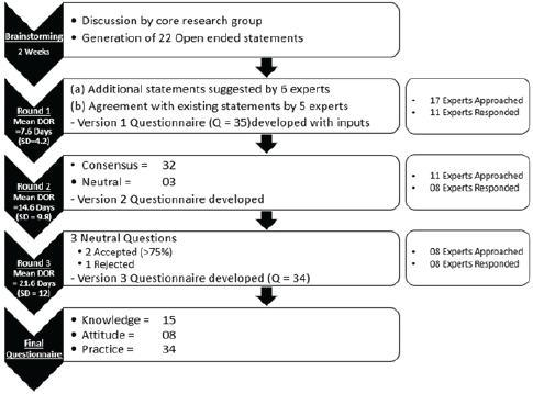 Results: 11 (64.7%) of 17 contacted experts responded in Round 1 including 6 (54.4%) who gave additional inputs and 5 (45.6%) who agreed to all statements. In round 2, 8 out of 11 experts responded to the 35-item questionnaire on knowledge (n = 16), attitude (n = 8) and practice (n = 11). 32 questions obtained agreement and 3 (8.5%) had neutral consensus. These were modified for round 3, in which consensus on 2 (66.6%) was attained. The final questionnaire comprises 34 items with 15, 8 and 11 questions on in the sections of knowledge, attitude and practice (KAP), respectively.