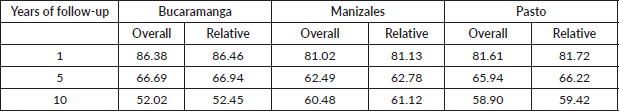 Table 2. CL in Bucaramanga, Manizales and Pasto (Colombia): OS and RS (%) at 1, 5 and 10 years after diagnosis.