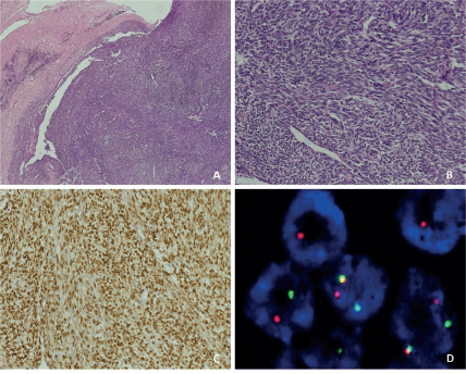 Figure 2. Histopathology of a 33-year-old female with cardiac synovial sarcoma synovial sarcoma – (a): Histological photomicrograph showing a spindle cell tumour with fascicular pattern of arrangement. (H&E 40×); (b): High power showing cells with spindled morphology with high N/C ratio with coarse chromatic and scanty cytoplasm. Mitosis can be noted. (H&E 200×); (c): IHC for TLE1 showing nuclear immunoreactivity; (d): FISH performed using break-part probes for SS18 gene showing spilt signals indicating SS18 gene rearrangement.
