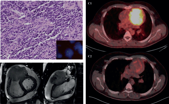 Figure 3. 31-year-old male with desmoplastic small round cell tumour arising from right ventricular outflow tract – (a): Histological photomicrograph showing a malignant round cell tumour with undifferentiated tumour cells with high NC ratio and scanty cytoplasm. (H&E 200×); FISH performed using fusion probes for Ewsr1-WT1 gene showing fused signals indicating EWSR1-WT1 fusion (Inset); (b): Cardiac MRI – short axis view (B1) and 2 chamber view (B2) showing expansile proliferative mass lesion involving the right ventricular outflow tract; (c): FDG PET-CT before (C1) and after (C2) 6 cycles of VAC chemotherapy.