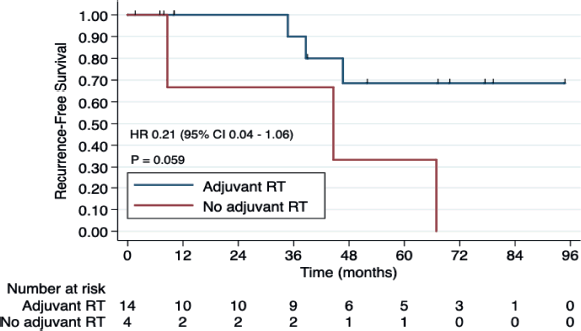 Figure 1. RFS according to adjuvant RT (yes versus no) among patients with ACCB. Abbreviations: RT, radiotherapy.