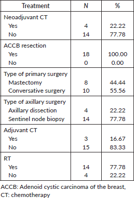 Table 2. Treatment details of patients diagnosed with local or locally advanced ACCB treated in a tertiary cancer center in Brazil (N = 18).