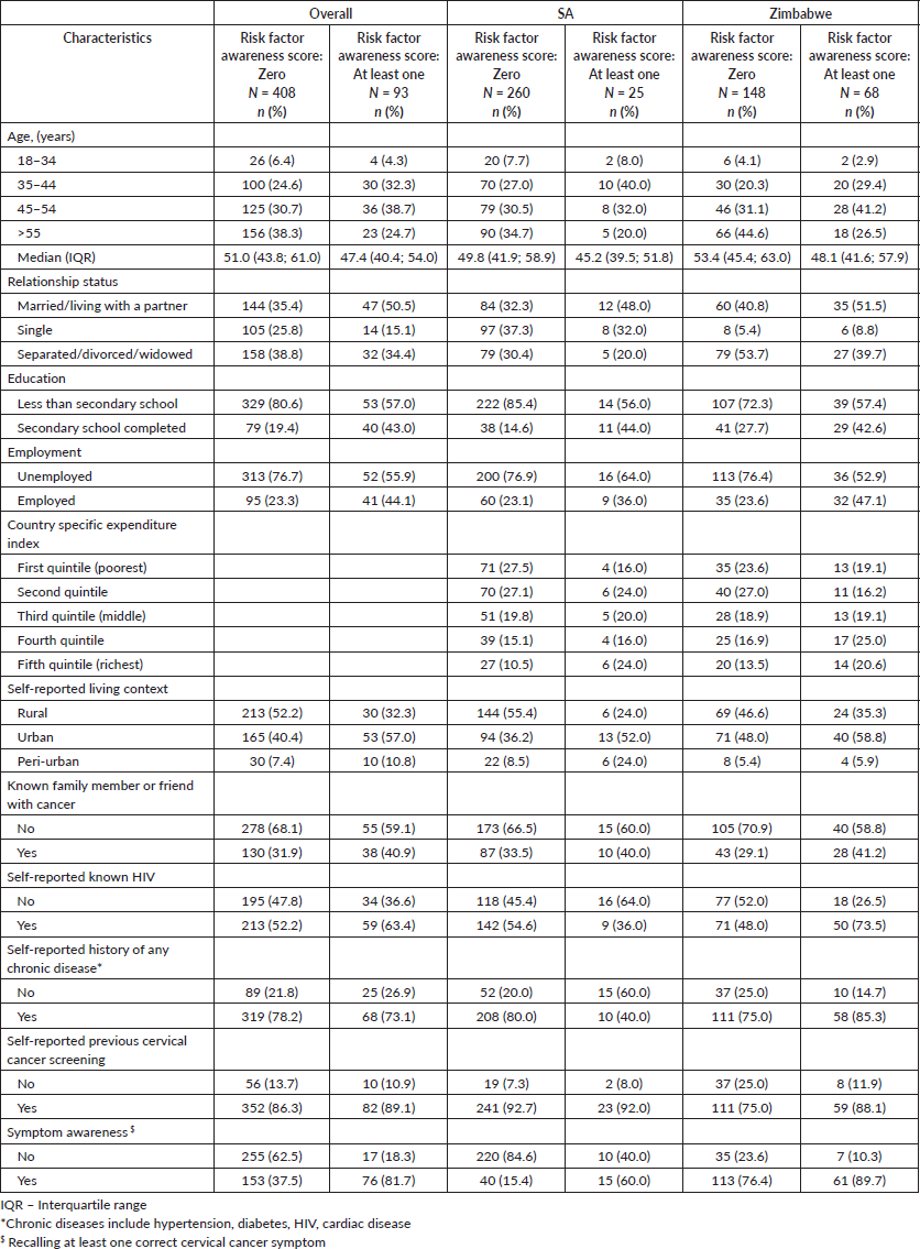 levels of cervical cancer awareness, particularly among women in SA. For both symptom and risk factor awareness, a far higher proportion of women from Zimbabwe were able to recall at least one symptom or risk factor of cervical cancer compared to women from SA. Among South African women, the level of education and self-reported living context were associated with symptom awareness, while having a chronic condition was associated with less risk factor awareness. Among Zimbabwean women, the expenditure index was associated with symptom awareness, while self-reported HIV was associated with risk factor awareness.